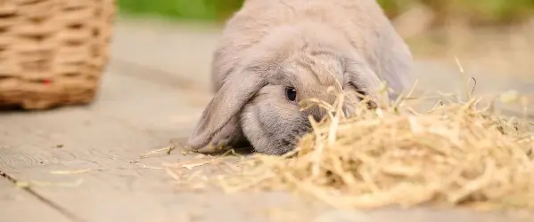 When it comes to food, good quality hay makes up the majority of a healthy rabbit diet. Rabbits should eat a portion of hay roughly the same size as their body every day. Hay is an excellent source of fibre, which helps keep a rabbit’s teeth in good condition and aids digestion.